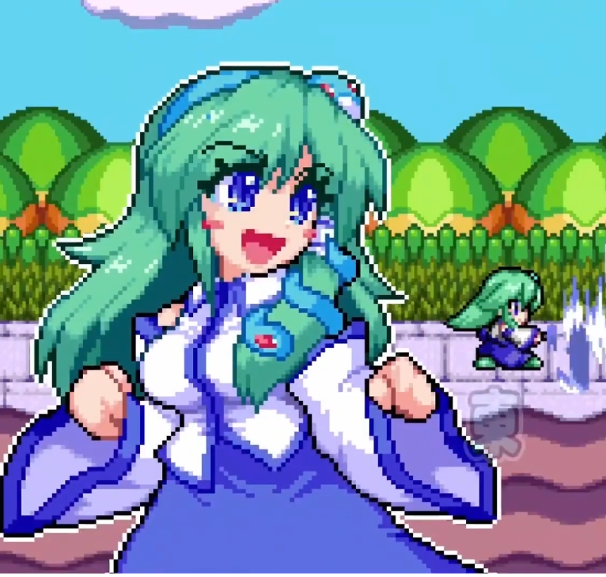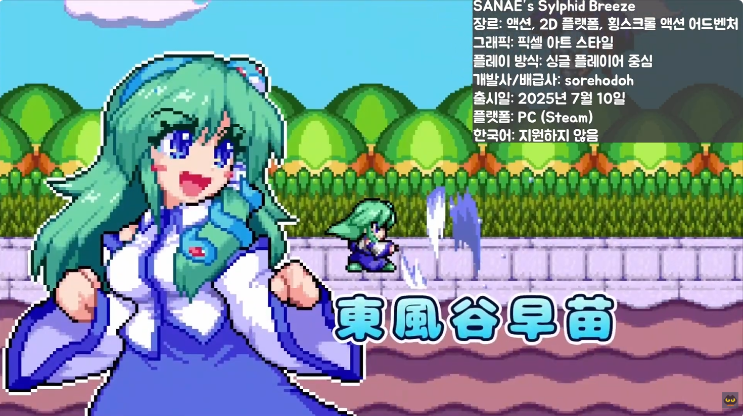 이 작품은 일본 유명 탄막 슈팅 게임 시리즈인 Touhou Project 속 캐릭터 **SANAE KOCHIYA(산에 코치야)**를 주인공으로 한 팬 게임입니다. 게임은 귀여운 픽셀 아트와 풍성한 액션 요소, 그리고 독특한 능력 시스템을 결합한 횡스크롤 액션 게임입니다.