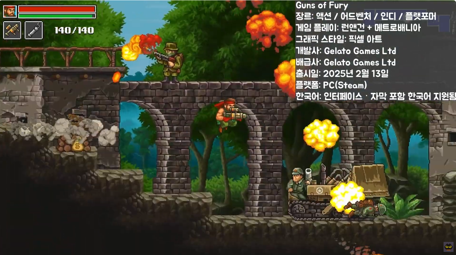Guns of Fury는 레트로 감성의 액션 플랫포머 슈팅 게임입니다. 대표적인 런앤건 액션 스타일과 메트로배니아 장르가 결합된 구조로, 넓은 맵을 탐험하면서 다양한 무기와 능력을 얻고 강력한 적과 보스들을 상대하는 게임입니다.